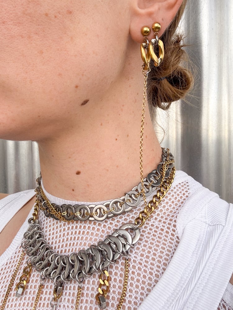 Boucles d'oreilles réalisées à partir de rondelles industrielles et d'une maille cubaine.