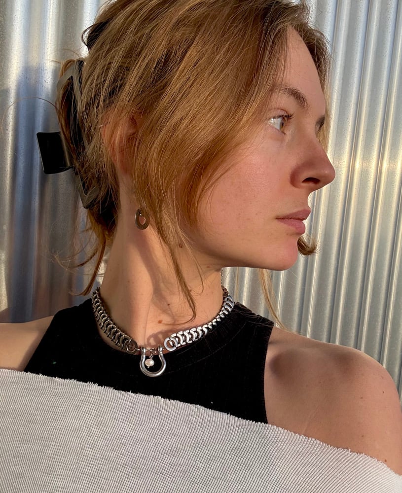 Collier réalisé à partir de rondelles industrielles, d'une manille et de perles vintage.