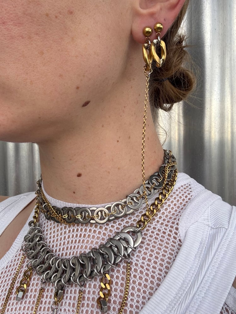 Collier réalisé à partir de rondelles industrielles assemblées à la main avec une chaine issue d'un stock endormi, la chaine torsadée autour du collier est upcyclée.
