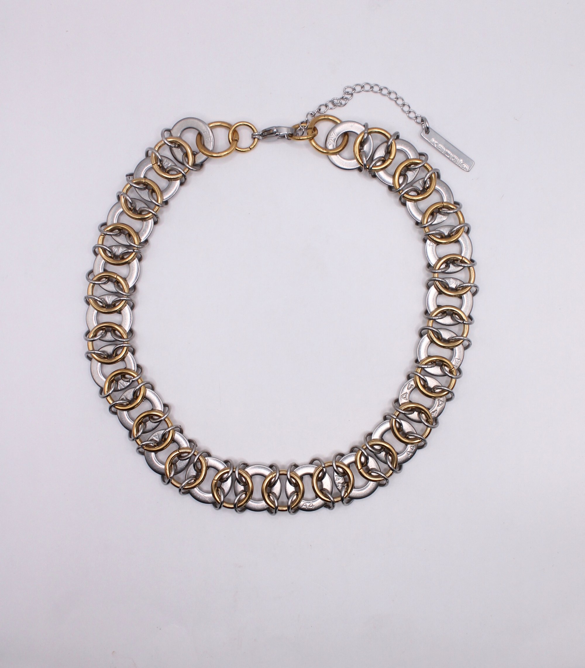 Collier fabriqué à la main à partir de rondelles industrielles et d'anneaux provenant d'anciens bijoux,
