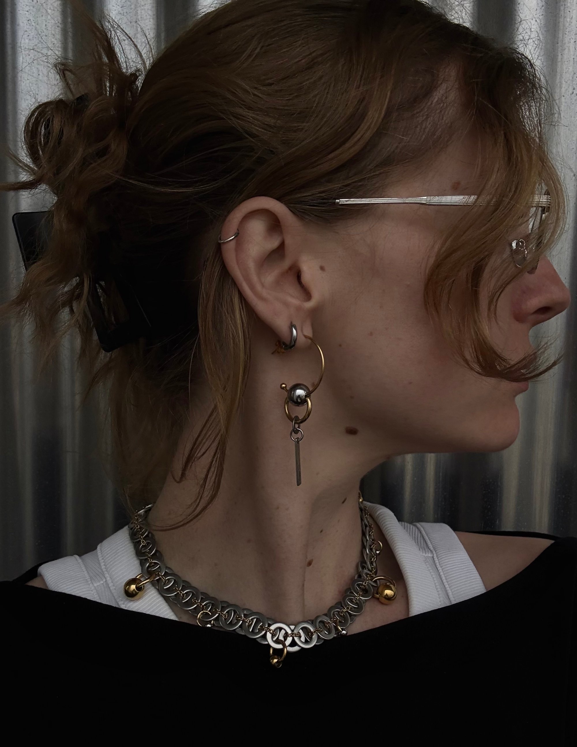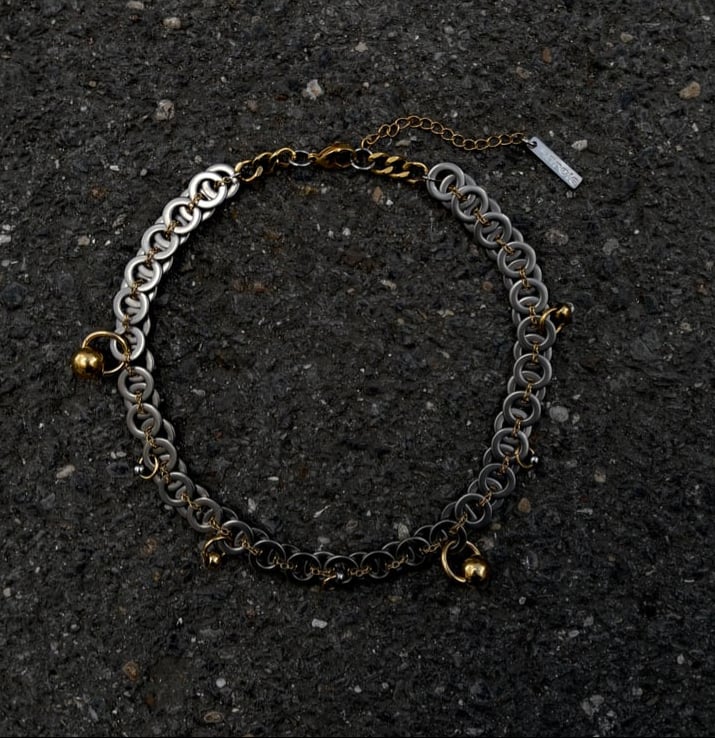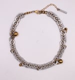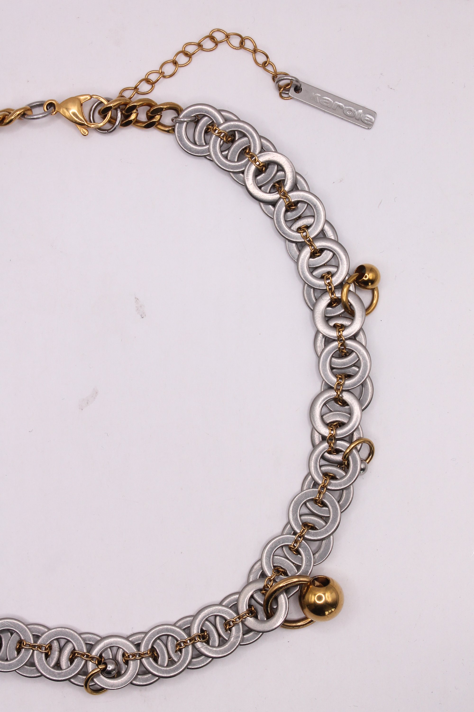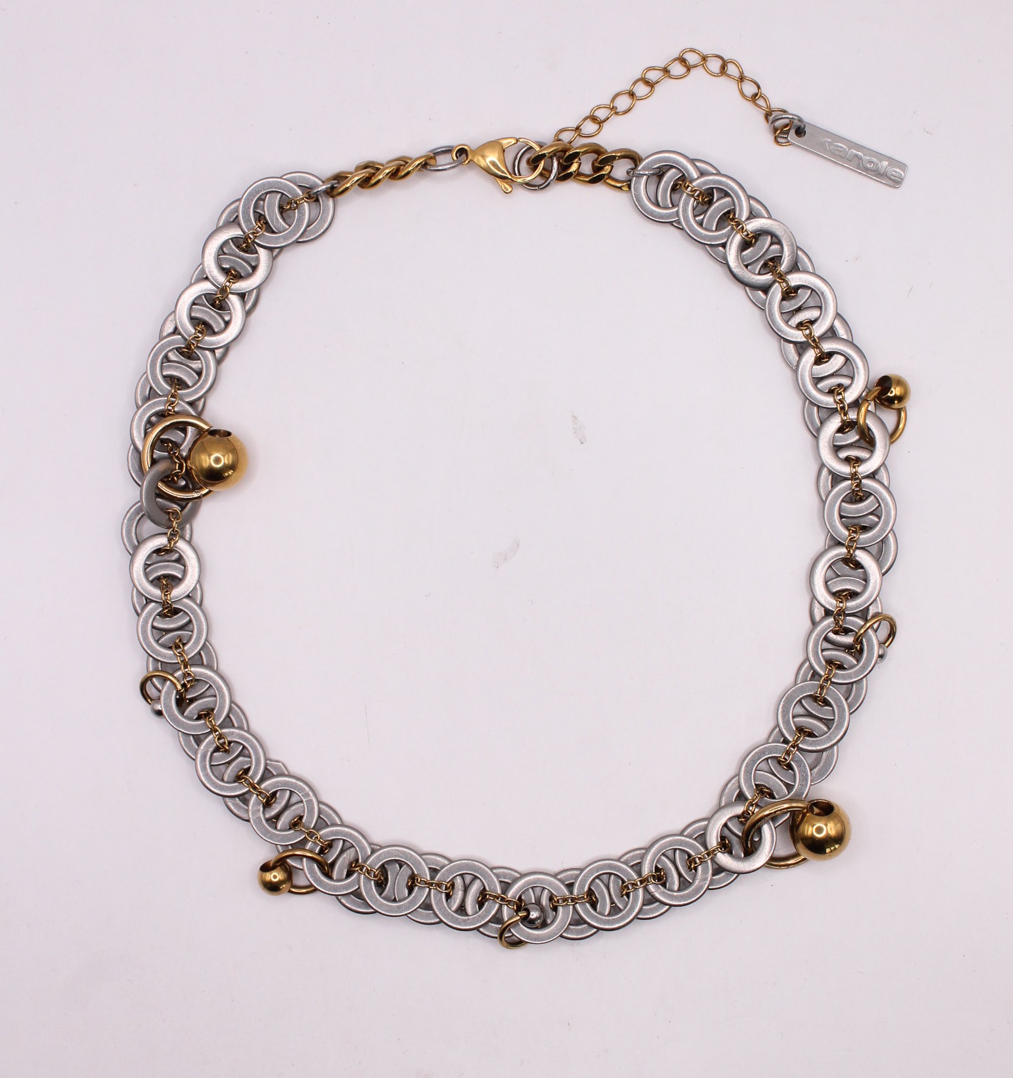 Collier réalisé à partir de rondelles industrielles assemblées à la main avec une chaine issue d'un stock endormi et de perles métalliques.