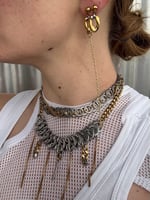 Collier fabriqué à partir de rondelles industrielles et d'éléments upcyclés (chaines cubaines dorés, boulons)